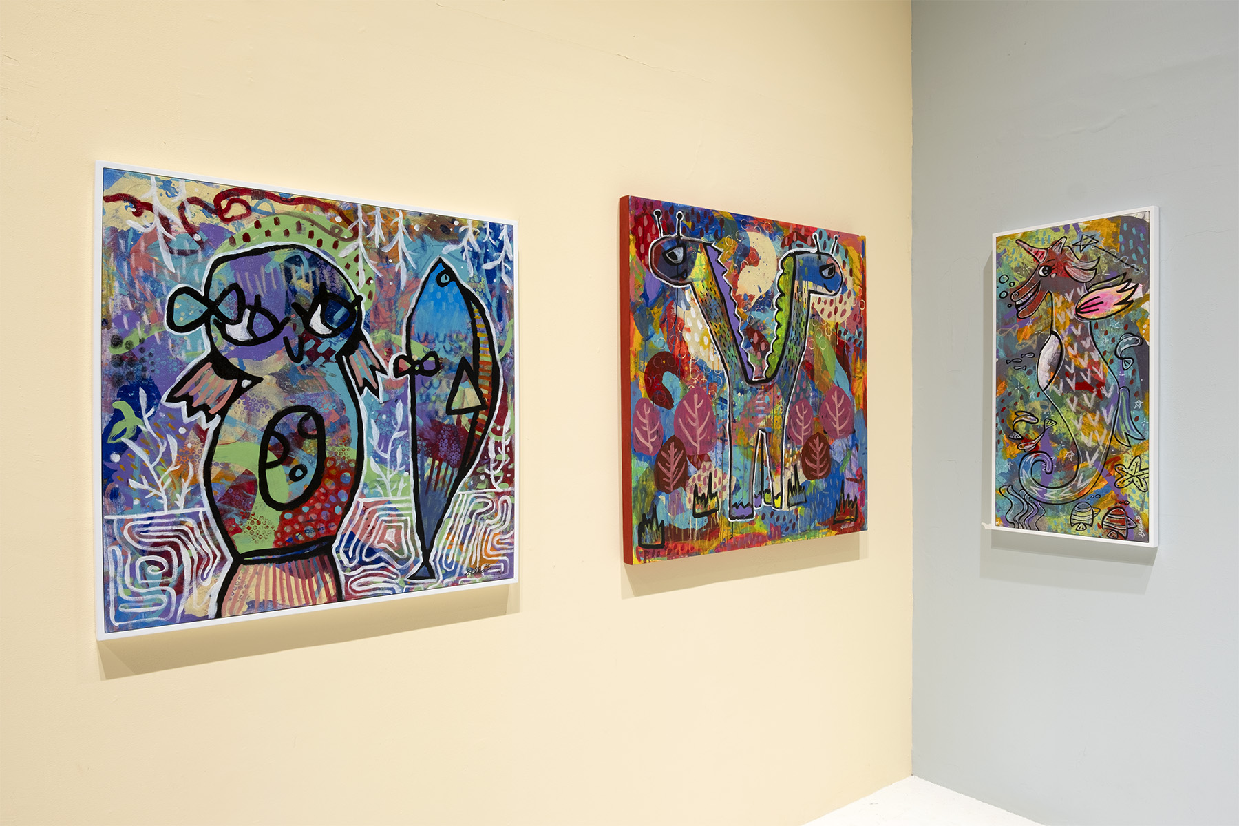 Dalam berkarya, aku percaya bahwa kuas bukanlah satu-satunya media untuk membuat lukisan. Seperti yang terdapat pada tiga karyaku berjudul Giraffesaurus, Lovers, dan Halu, aku mengekspresikan ketertarikanku pada dunia binatang dengan teknik gesut menggunakan sebuah alat dari patahan penggaris yang aku buat sendiri. Aku juga menambahkan beberapa sentuhan pastel, kuas, dan marker untuk membuatnya lebih indah.