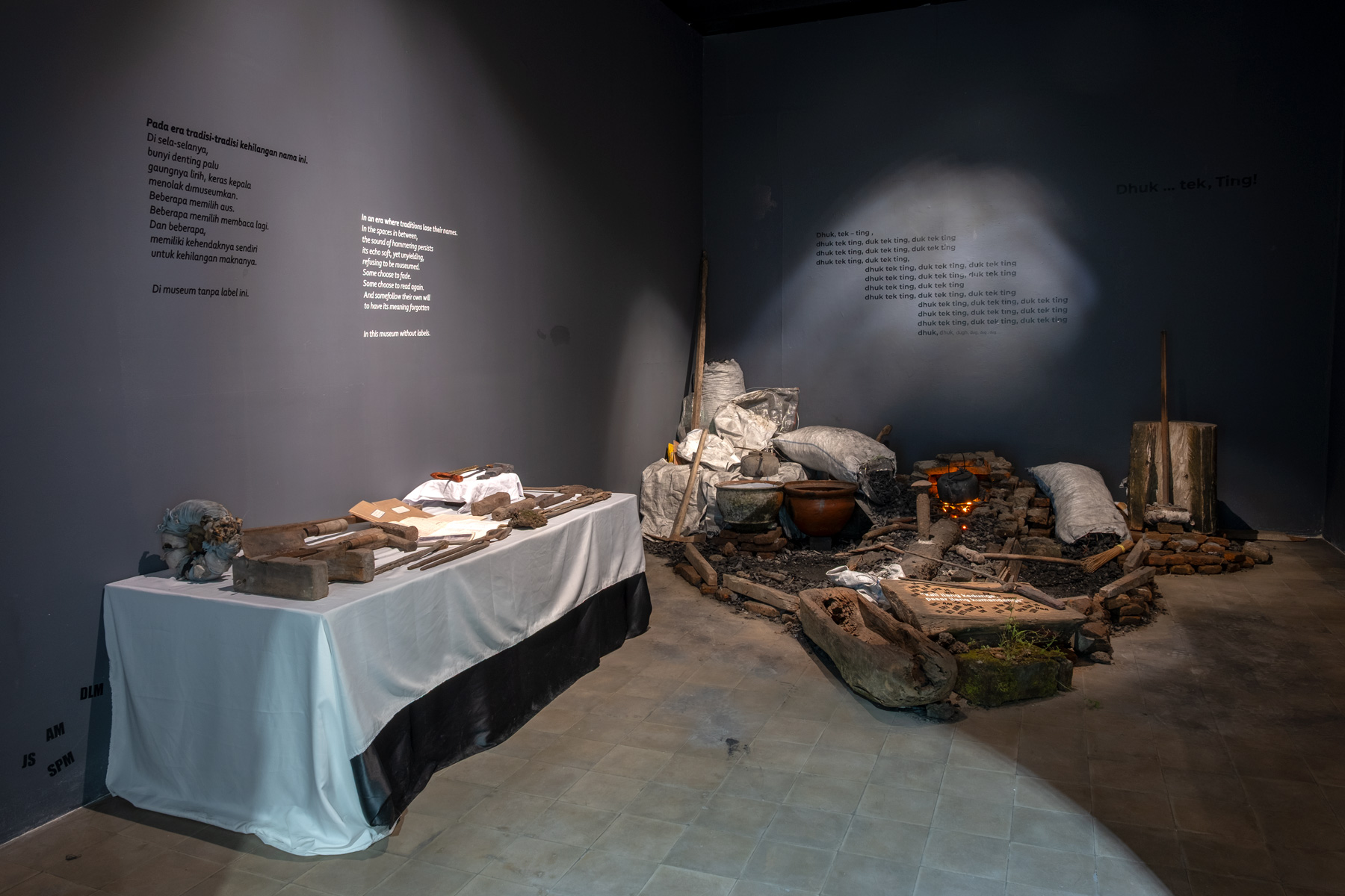 Karya instalasi multimedia ini merefleksikan amalan para pande besi-sebuah motif yang tak hanya melibatkan tenaga fisik, tetapi juga dedikasi dan pemahaman mendalam terhadap bahan dan proses ketukangan yang khas. Tradisi pande besi-kita teringat keris-dan ketukangan di Nusantara pada umumnya terus menerus memudar seiring laju modernisasi produksi alat-alat yang lebih cepat dan mudah. Di masa silam, pekerjaan para pande dianggap adiluhung, mereka dihormati sebagai para empu. Di desa Jodog, Gilangharjo, Kecamatan Bantul, Yogyakarta, misalnya -sentra lingkungan kerja para pande yang Surya Adiwijaya amati-hanya tersisa segelintir empu saja dari sekitar puluhan nama yang pernah berjaya. Inisial nama para empu biasanya dituliskan pada alat ciptaannya. Identitas tersebut pada karya ini sebagai pengingat akan berlangsungnya tradisi panjang keempuan. Surya Adiwijaya sendiri adalah bagian dari trah pande, cucu seorang empu.