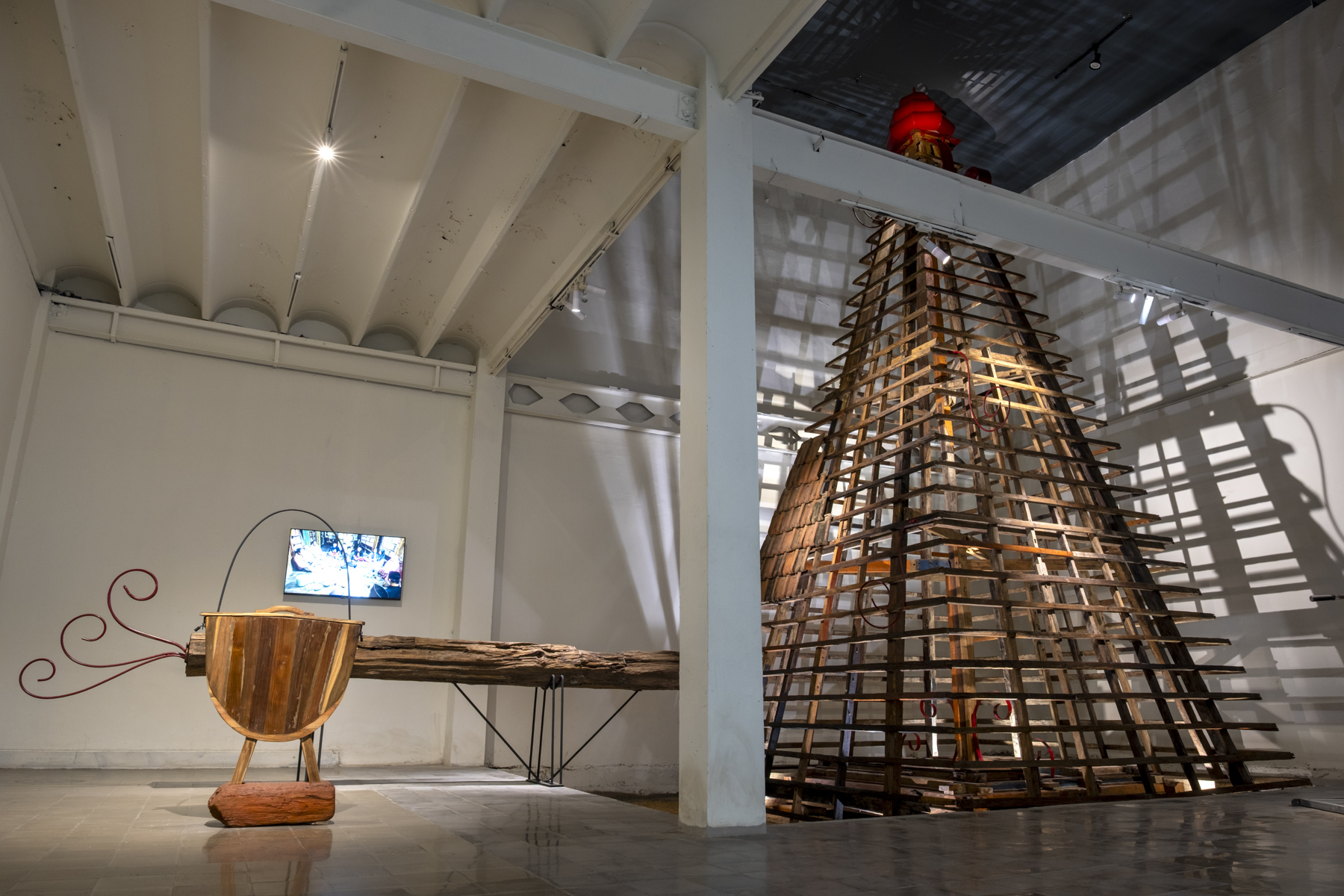 2025 | mosque canopy with scrap wood, cast iron, scrap iron plates, large pieces of wood, frog roof tiles, 355 x 355 x 728 cm; wooden post, 30 cm diameter, 400 cm long, cast iron support, 16 mm; charity box 90 x 55 x 23 cm; 3 photos, 50 x 40 cm each and video of songs of practice, 12'