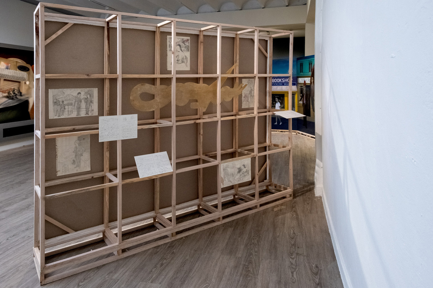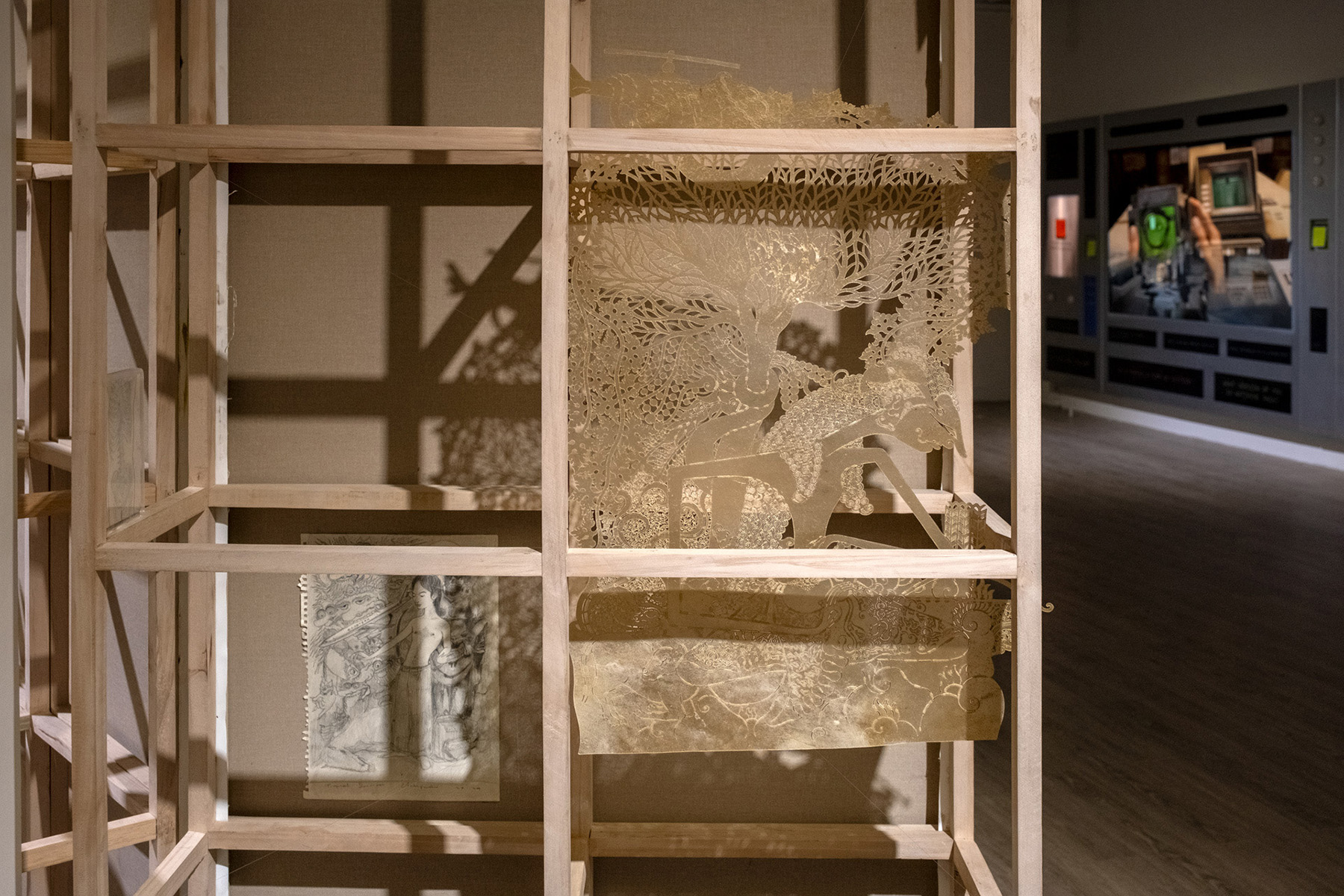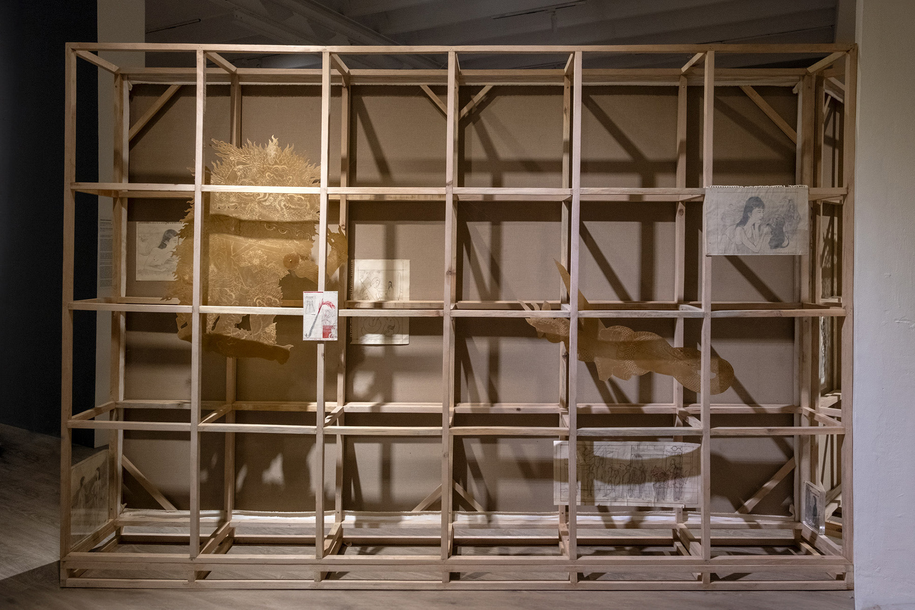 Gebyok, istilah dalam bahasa Jawa yang menunjuk dinding penyekat di dalam rumah, umumnya papan lebar dari kayu dengan hiasan atau ukiran. Bentuk partisi atau dinding tak kedap suara ini, memberi makna pada kehidupan komunal, memisahkan tapi juga menyatukan, menjauhkan sekaligus mengantarai, di luar dan di dalam. Lukisan Urubingwaru yang meminjam fungsi seperti partisi ini tak sepenuhnya rampung dalam wujud gambar. Karya ini dimaksudkan berperan serta dalam cerita tentang dunia di mana arketip kultural, kerangka sejarah, seruan pada semesta berkelindan dalam kesadaran universal. Lukisan Urubing adalah dinding tutur yang menciptakan batas sekaligus menautkan dunia-dunia, yang di sana dan di sini, yang dikenali dan yang asing. Inilah representasi dari narasi dan tutur yang membuatnya tak berhenti di ruang pamer.