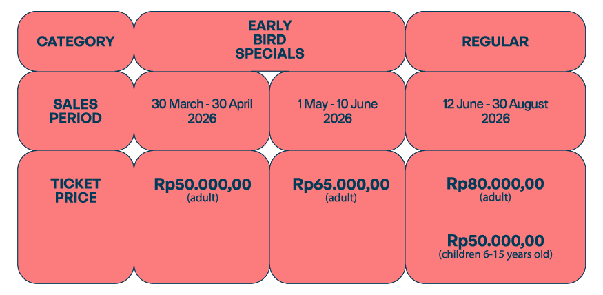 8. Penukaran dan penggunaan tiket prajual dapat dilakukan mulai tanggal 20 Juni–30 Agustus 2026 pukul 10.00–21.00 WIB. Hari libur nasional dan tanggal merah tetap buka.